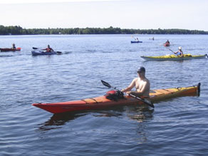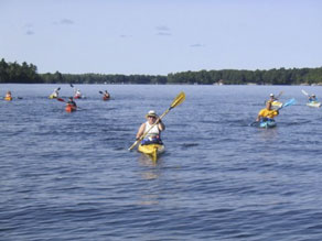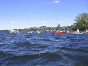 Lake. Dan Lachance in the support boat and the kayakers experienced their first rough water when entering the Upper Rideau. Thankfully no problems occurred as we were close to our evening destination at Narrows Lock. Betty and Peter Ivy supplied dinner for the K4C team and Kevin thanked them for their generosity. This is the